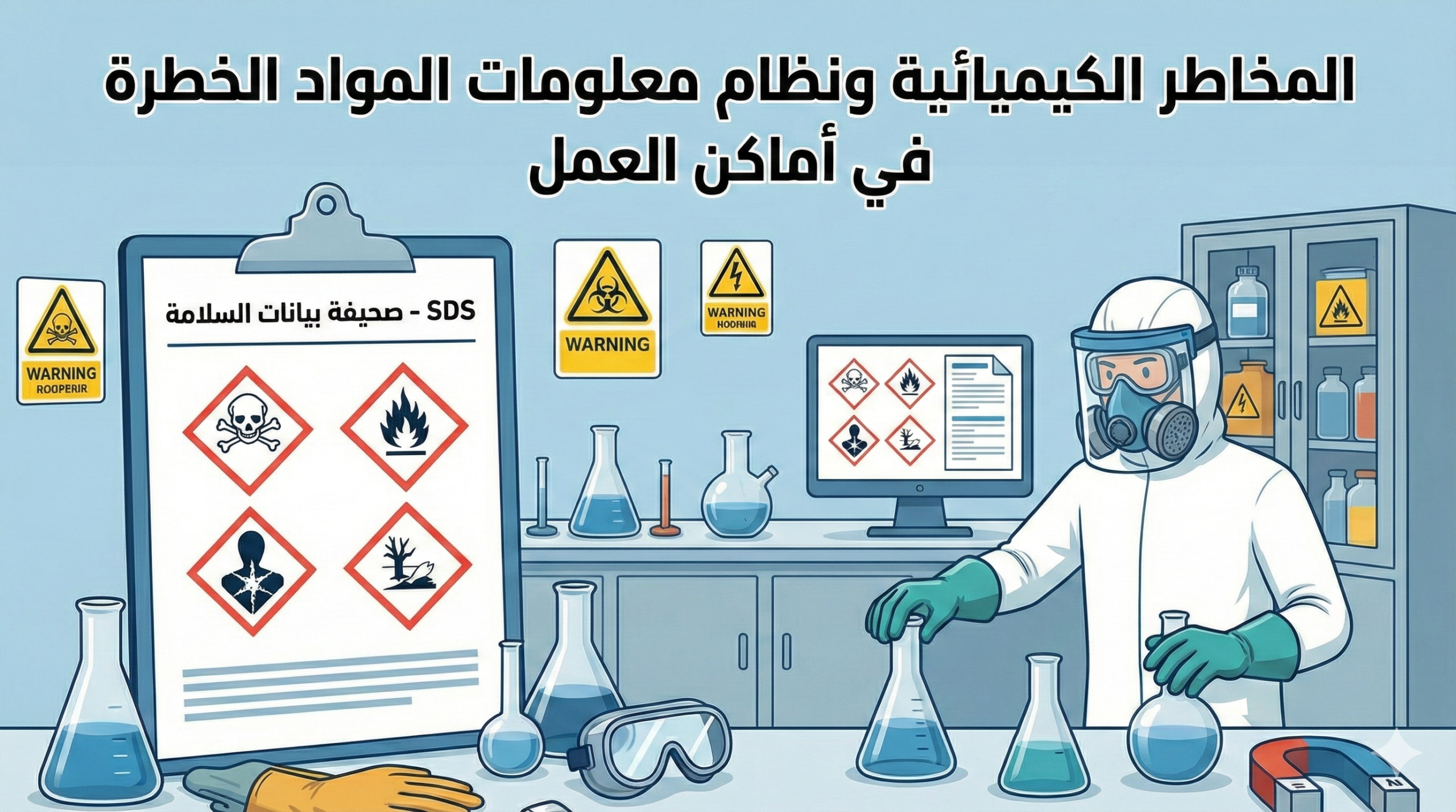 دليلاً إرشادياً شاملاً  يركز على السلامة المهنية عند التعامل مع المواد الكيميائية والخطرة داخل المختبرات وبيئات العمل. يوضح المحتوى أهمية استخدام نظام معلومات المواد الخطرة، مع التركيز بشكل خاص على ضرورة وجود ملصقات تحذيرية دقيقة وبطاقات بيانات السلامة (MSDS) التي تشرح الخصائص الفيزيائية والمخاطر الصحية لكل مادة