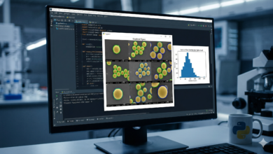 يتم فصل الحبيبات النانوية وعدها وحساب القطر المكافئ (Equivalent Diameter) لكل حبيبة: