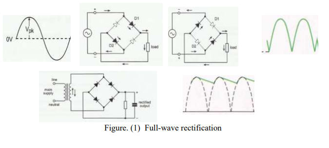 The conversion of alternating voltage (changes its direction) to directed voltage. This conversion is called rectification. To achieve the rectification of alternating voltage you must to use some circuit. The full-wave rectifier consists of four diodes, see Fig. 1. For a sinusoidal waveform the diodes D1 and D2 pass a current at first part 1 of waveform, because they are forward-biased. At the same time the diode D3 and D4 pass