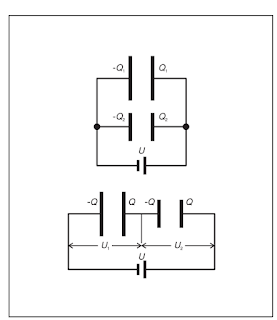 In a series connection, both capacitors take the same charge Q. The applied voltage U is the sum of the individual voltages U1 and U2: