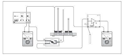 The capacitors are set up side by side, and both parallel or series connection can be chosen. An insulating plate between the two capacitors ensures that the charges on the capacitors cannot influence each other through electrostatic induction. Charges are measured with an electrometer amplifier operated as a coulombmeter. Any voltmeter may be used to display the output voltage UA.