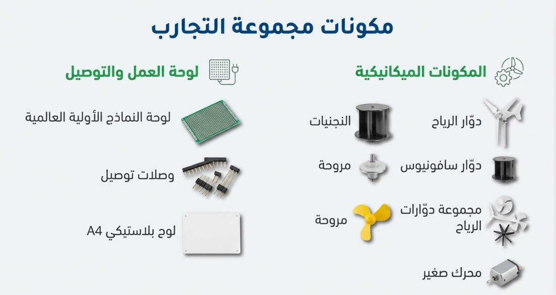 قائمة مفصلة بالمعدات التقنية المستخدمة، مثل أجهزة القياس والمحركات والمراوح المخصصة للتجارب المخبرية. وبالإضافة إلى الجانب النظري، توضح الصور الإرشادية طرق التركيب الصحيحة والآمنة لمكونات المراوح لضمان دقة النتائج العلمية
